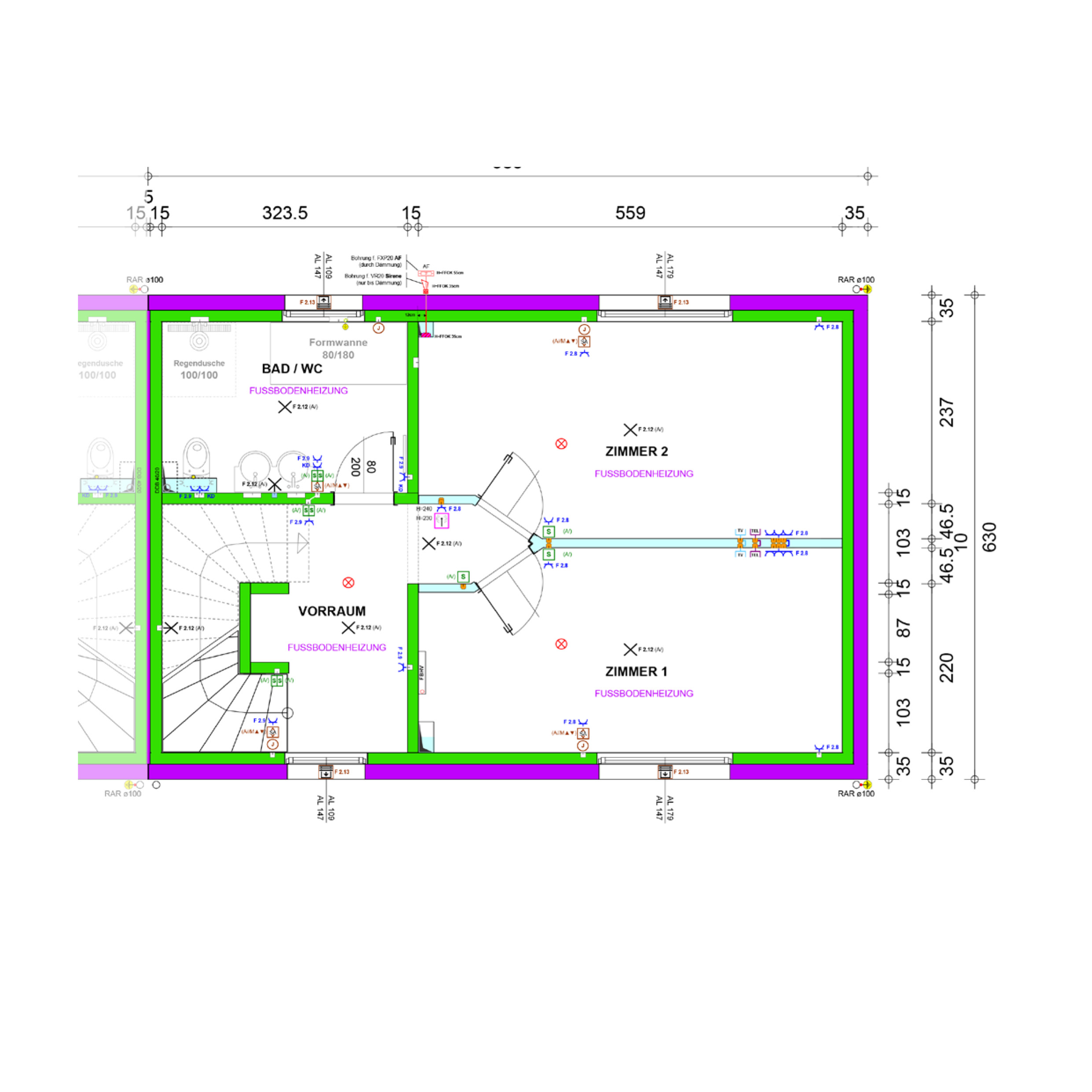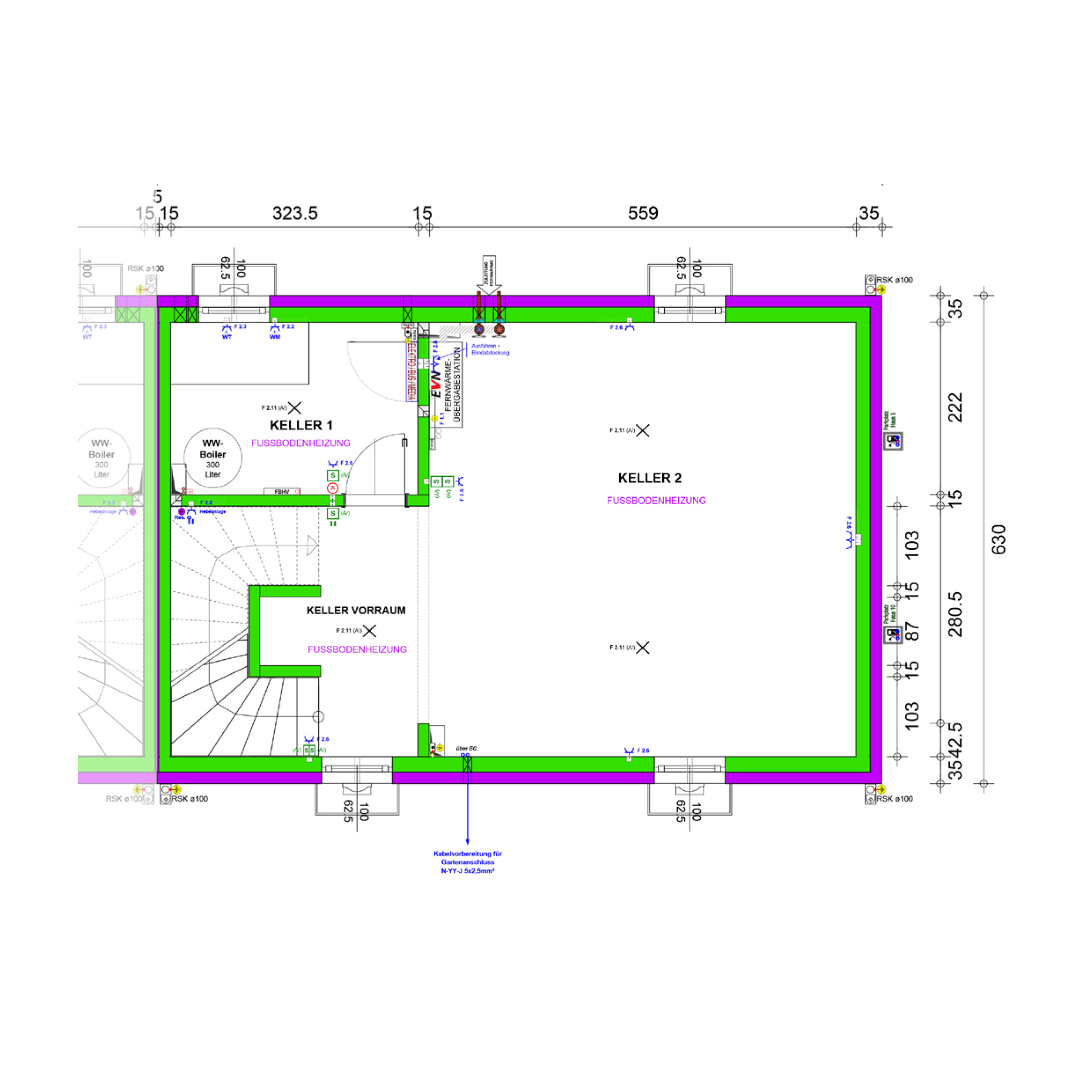 - druckwasserisolierter Keller mit Fußbodenheizung